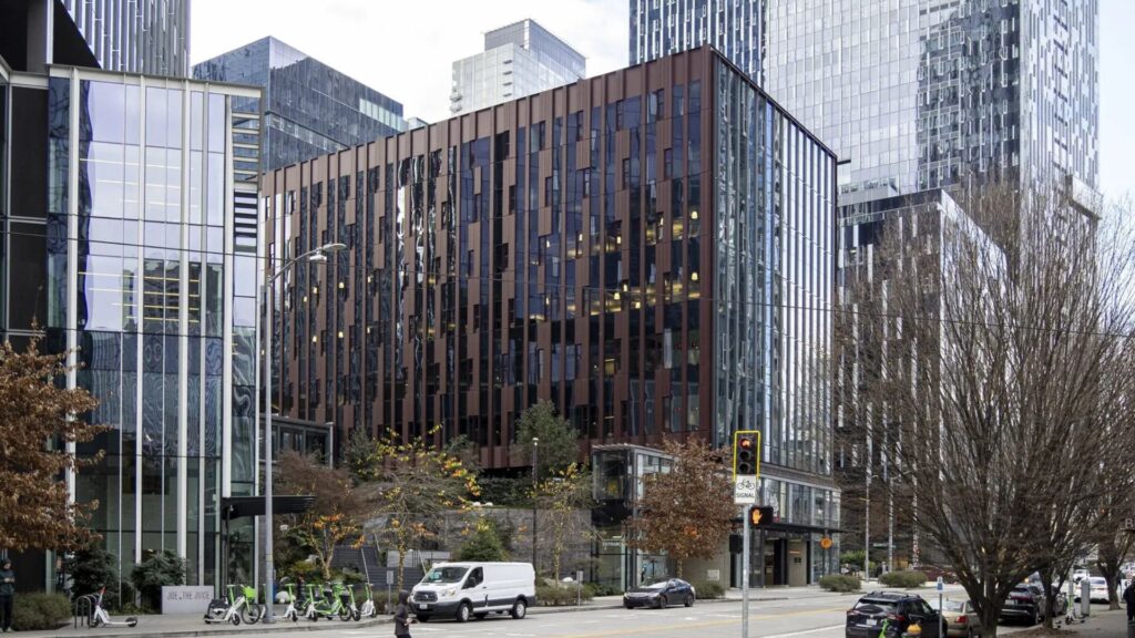 Amazon buildings in South Lake Union in Seattle in January. Amazon, Expedia Group, Meta and Microsoft all reported layoffs, albeit a small fraction of their overall employment, writes the columnist. (Kevin Clark / The Seattle Times)
